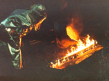 Dans une pluie d'étincelles jaillissant de partout, le sculpteur revêtu